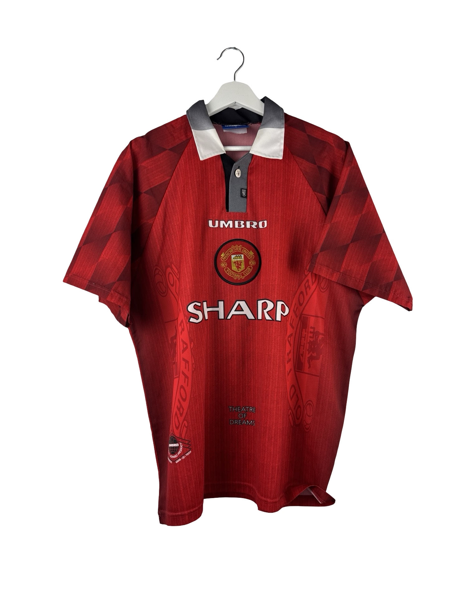 Maillot vintage de Manchester United saison 1998/1997. Maillot rétro de Man Utd rouge et noir signé Umbro et son sponsor iconique Sharp. Floqué David Beckham 10;.