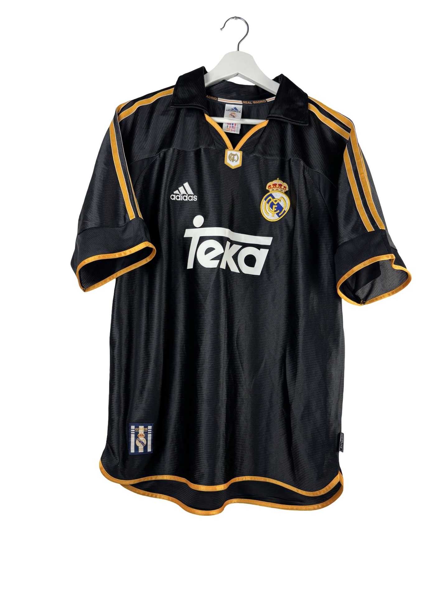 Maillot domicile du Real Madrid saison 1998/2000. Maillot domicile utilisé lors de la victoire du Real Madrid entrainé par Vicente del Bosque en Champions League en 2000. Finale maîtrisée avec une victoire 3-0 face au CF Valence. En 1999 le Real finira deuxième de Liga derrière le Barca. Le génie néerlandais Clarence Seedorf jouera 159 matchs au Real Madrid de 1996 à 1999. Maillot retro du Real Madrid signé Adidas et son sponsor mythique Teka. Epoque Seedorf, Raul, Roberto Carlos, Anelka, Morientes, Karembeu