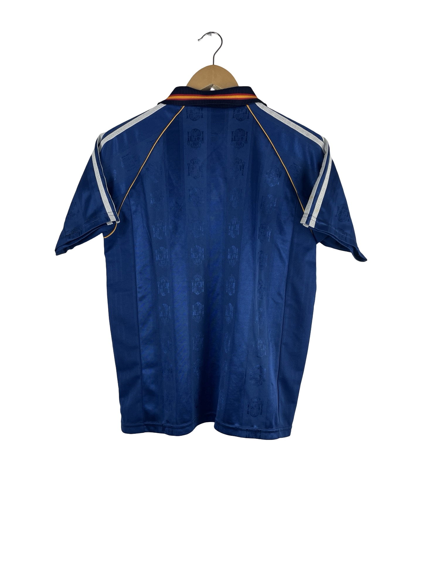 Maillot third de l’Espagne porté lors de la Coupe du Monde 1998 par les hommes de Javier Clemente. Ils n’arriveront pas à sortir du groupe composé du Nigéria, du Paraguay et de la Bulgarie. Malgré une écrasante victoire contre la Bulgarie, ça sera le Nigéria et le Paraguay qui se qualifieront pour les phases finales. Maillot classique de la Roja signé Adidas.
