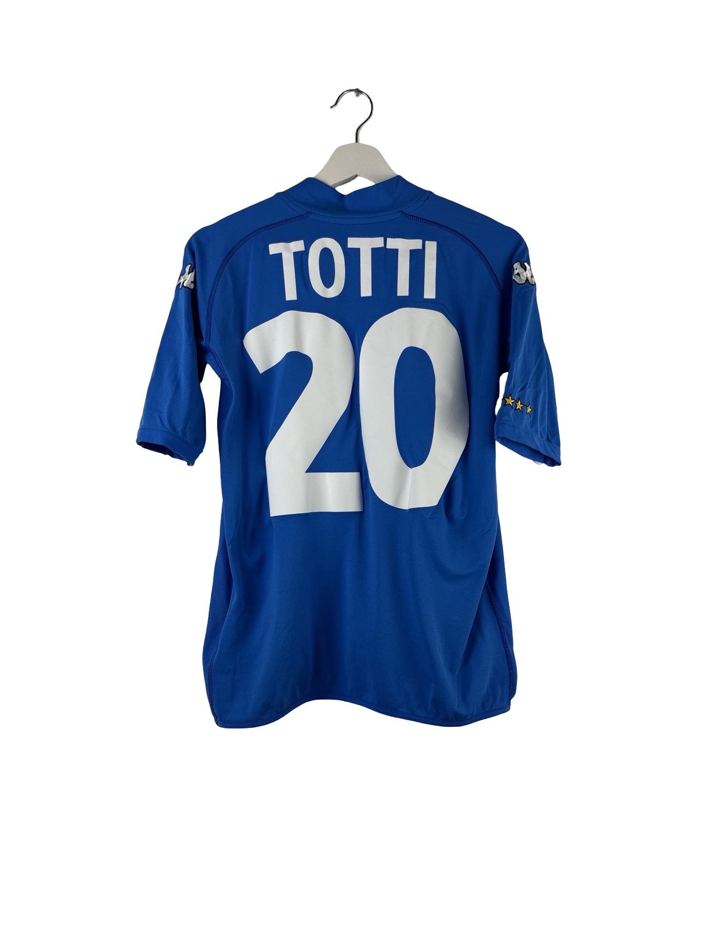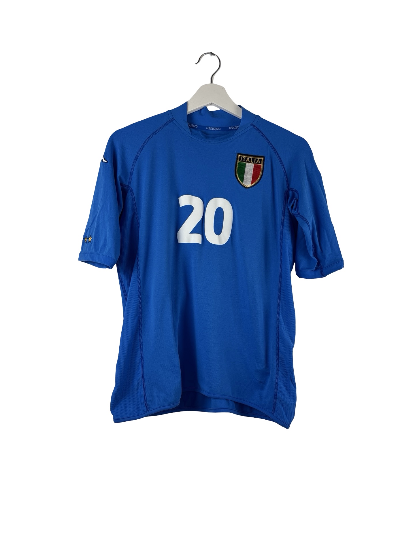 Emmenés par leur capitaine Paolo Maldini, les joueurs de la Squadra Azzurra atteindront la finale malheureusement perdue 2-1 en prolongation face aux Français avec ce magnifique but en Or de David Trezeguet. Maillot bleu signé Kappa, flocage Francesco Totti 10. Époque Totti, Inzaghi, Pessotto, Nesta, Cannavaro. Très beau maillot rétro Kappa de l’Italie !