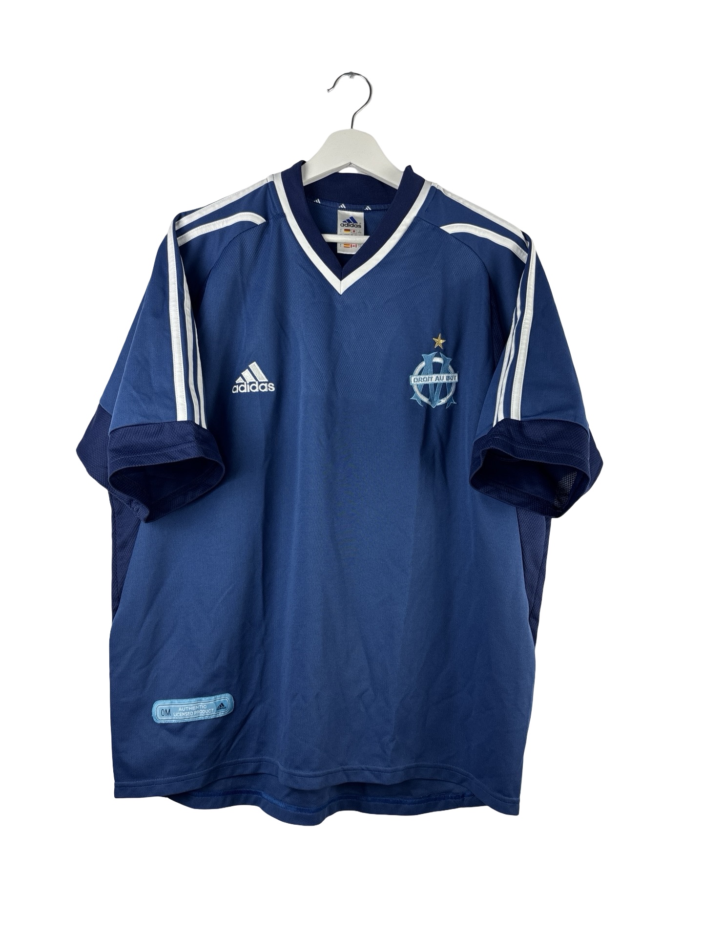 Maillot vintage de l’Olympique de Marseille domicile saison 2001/2002. Maillot classique bleu et blanc de l’OM signé Adidas. Logo Adidas et de l’OM brodé.