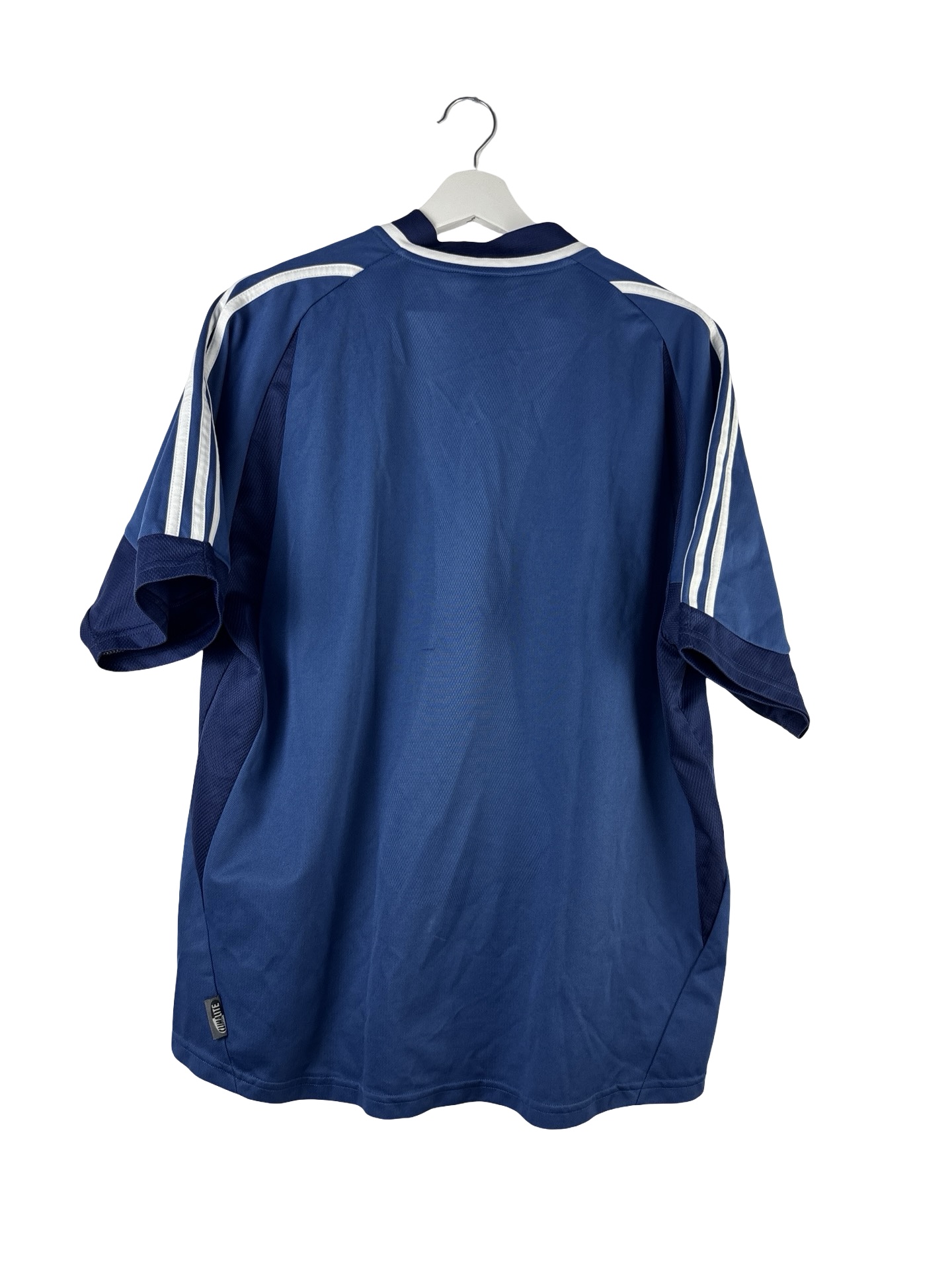 Maillot OM saison 2001/2002.Maillot extérieur porté après deux saisons catastrophiques. Les olympiens finiront 9ème de Ligue 1. De nombreux changements d’entraîneurs et les tensions entre Bernard Tapie et le directeur financier Pierre Dubiton alimenteront la saison du club marseillais. Époque Franck Leboeuf, Van Buyten, Bakayoko, Nouma, Lamine Sakho, Perez Alfonso 29.