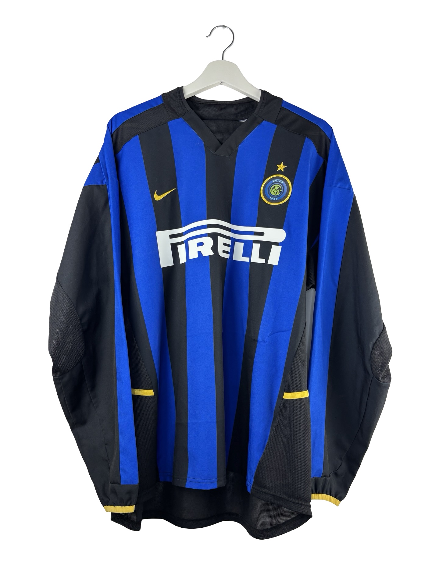 Maillot domicile porté par les Nerazzurri lors d’une saison où ils termineront le championnat à la 2ème place derrière la Juventus. Sur la scène européenne, les coéquipiers de Crespo se hisseront en demi finale mais sortiront avec le but à l’extérieur contre l’éternel rival milanais. Maillot classique bleu et noir de l’Inter, signé Nike et son sponsor iconique Pirelli.