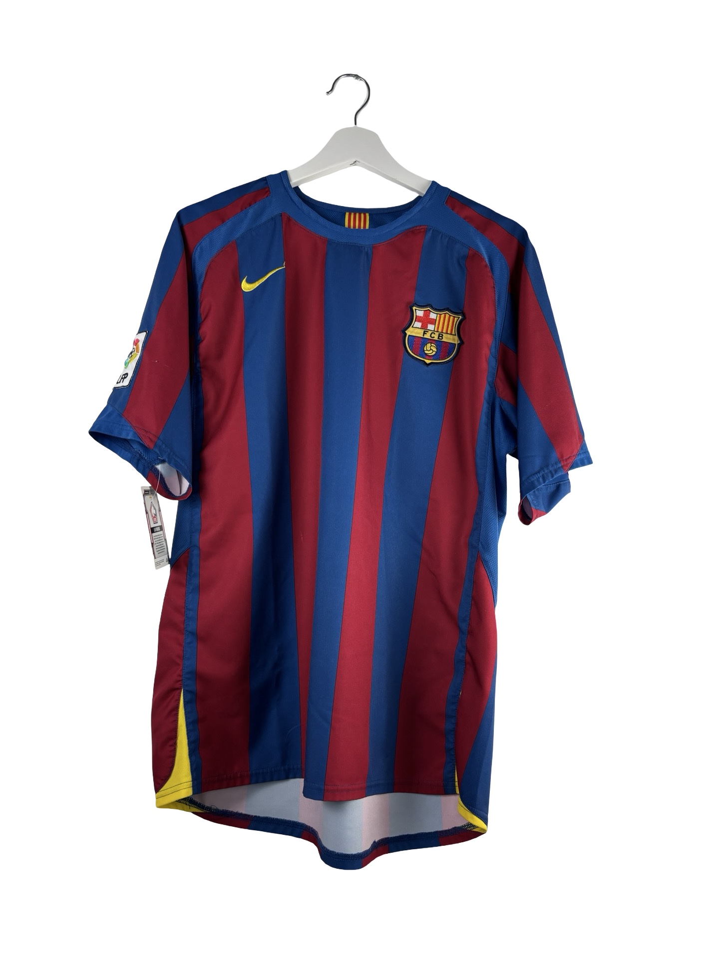 Maillot vintage du FC Barcelone saison 2005/2006. Maillot extérieur porté par les Catalans lors du triplé championnat/Ligue des Champions/Supercoupe d’Espagne. Ronaldinho sera un grand artisan de cette saison historique, avec 26 buts et 22 passes décisives TCC. C’est la dernière saison où Messi portera le numero 30. Époque Ronaldinho, Eto’o, Xavi, Messi, iniesta, Puyol