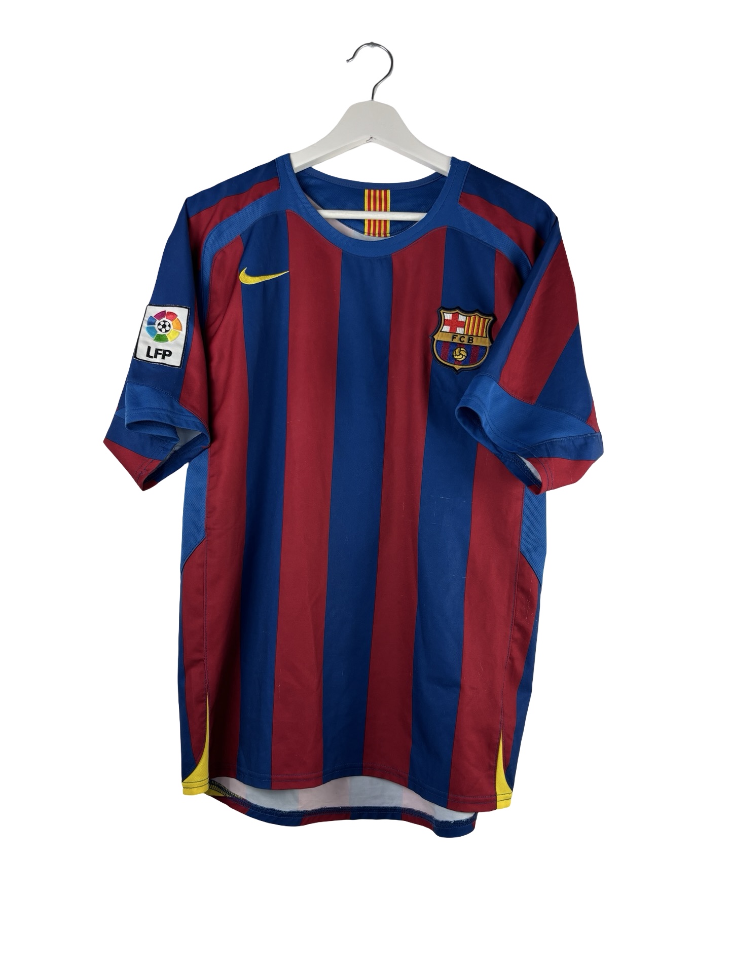 Maillot vintage du FC Barcelone saison 2005/2006. Maillot extérieur porté par les Catalans lors du triplé championnat/Ligue des Champions/Supercoupe d’Espagne. Ronaldinho sera un grand artisan de cette saison historique, avec 26 buts et 22 passes décisives TCC. C’est la dernière saison où Messi portera le numero 30. Époque Ronaldinho, Eto’o, Xavi, Messi, iniesta, Puyol