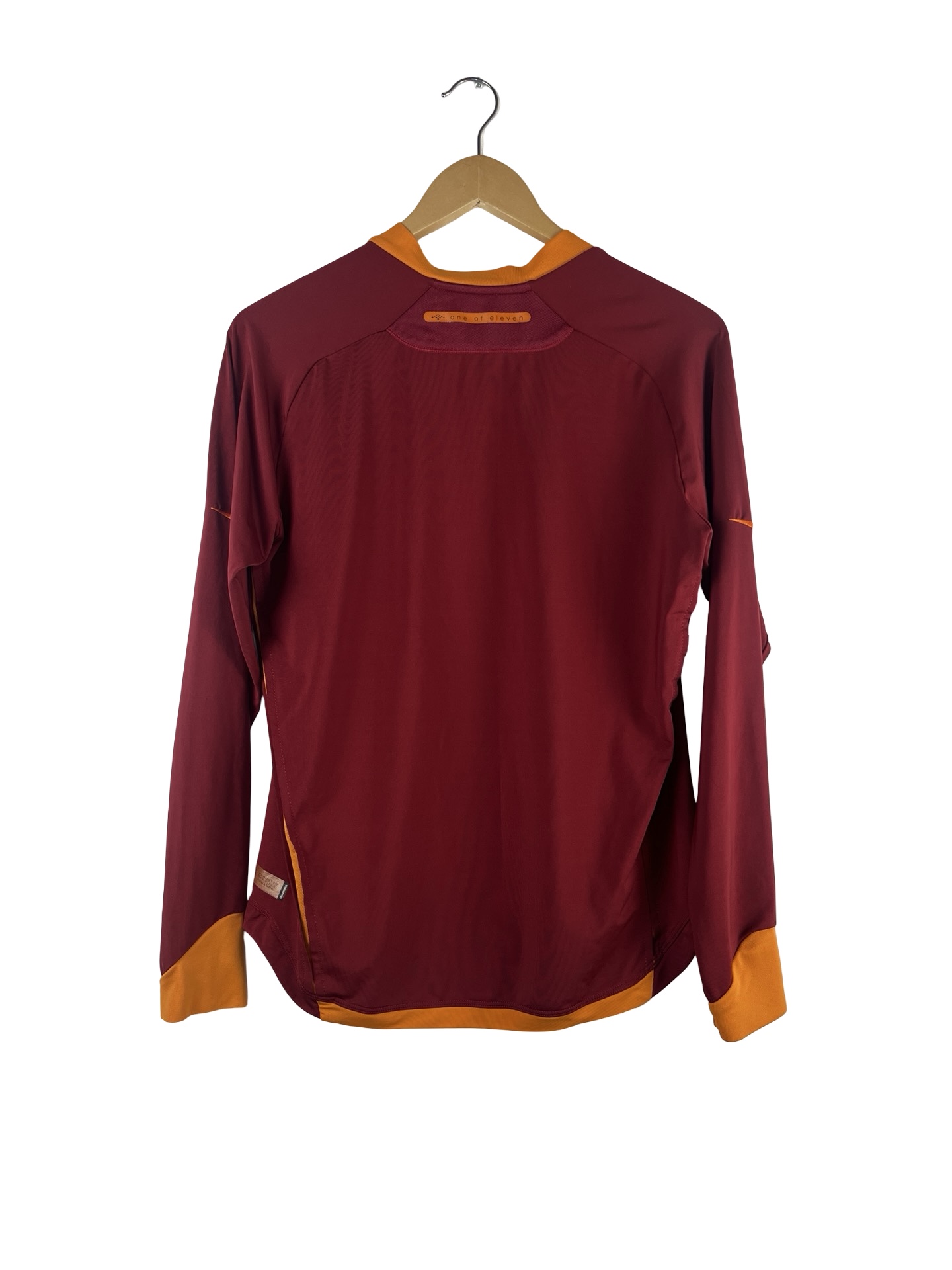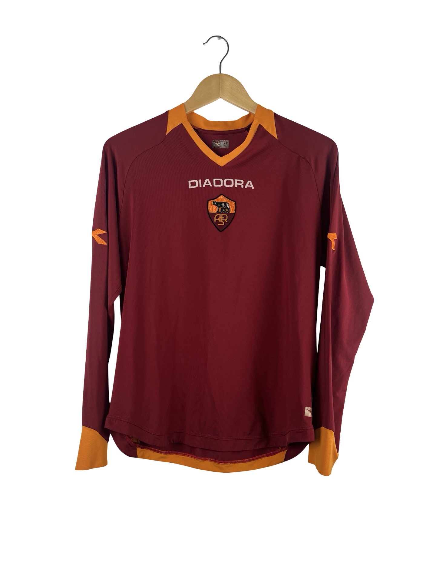Maillot domicile de l’AS Roma saison 2006/2007. Maillot domicile porté par les Romains lors d’une saison qui verra le club remporter la coupe d’Italie pour la première fois depuis 1991. Coté championnat, emmené par un Totti à 26 buts, les Romains termineront 2ème de Serie A derrière l’Inter Milan. Maillot classique de l’AS Roma orange et bordeaux signé Diadora. Époque Philippe Mexes, Rossi, Chivu, Pizarro, Mancini