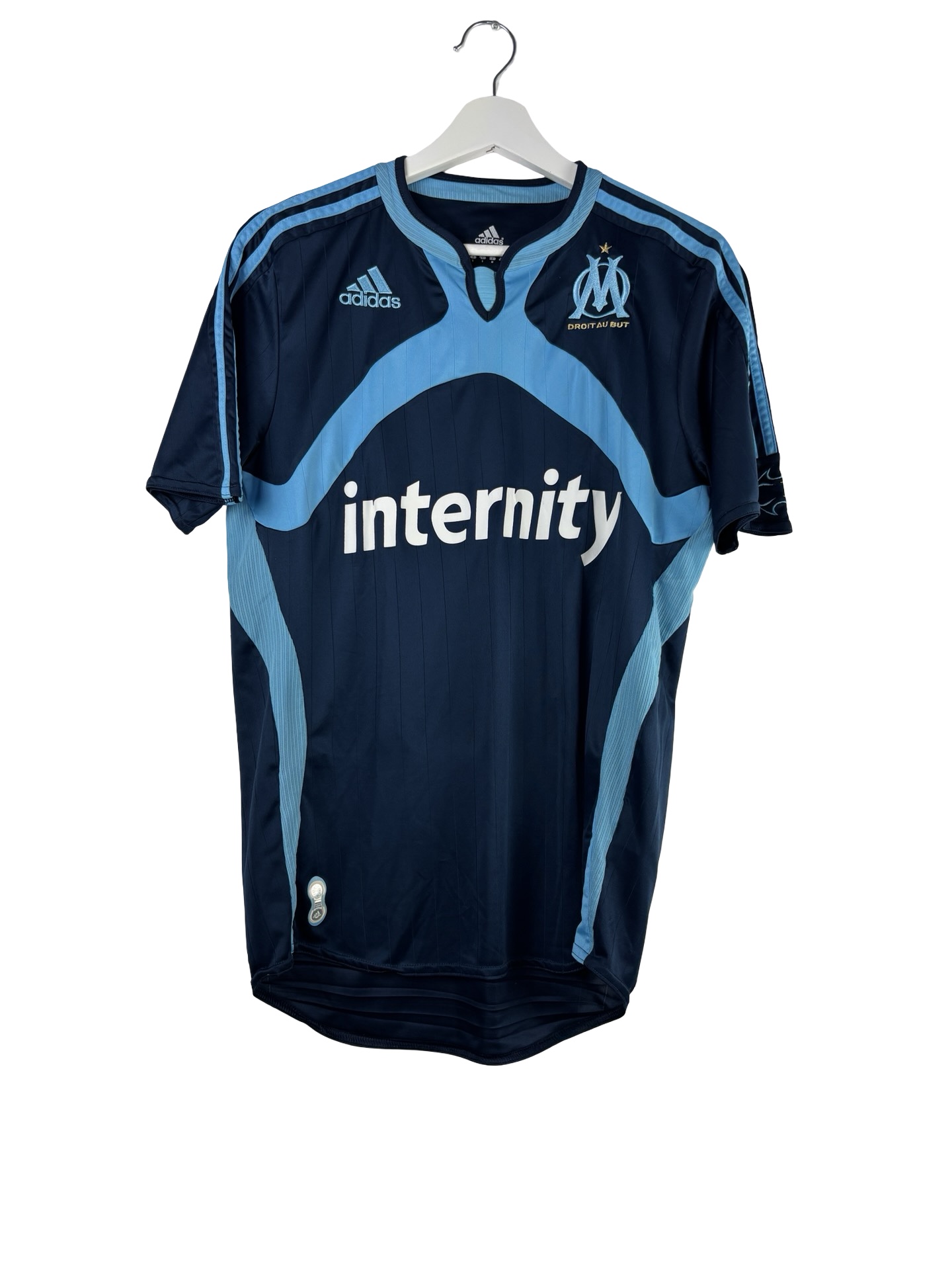 Maillot third de l’OM saison 2006/2007. Maillot porté par l’Olympique de marseille, présidé à l’époque par Pape Diouf, lors d’une saison où le club terminera deuxième de Ligue 1 derrière Lyon. L’équipe atteindra également la finale de la Coupe de France, finale perdue contre Sochaux aux tirs aux but. Classique de Marseille, bleu ciel et blanc signé Adidas.