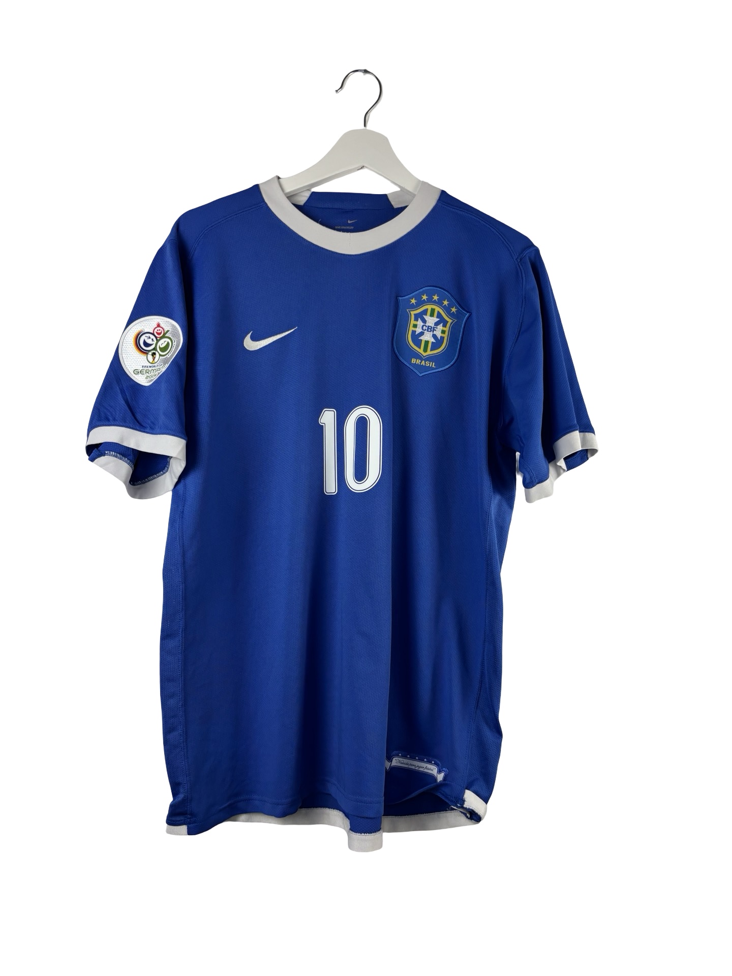 Maillot vintage du Brésil saison 2006. Maillot extérieur porté par la Seleção durant le mondial 2006 organisé en Allemagne. Le Brésil se verra éliminé en quart par l’Equipe de France de Zinédine Zidane malgré un incroyable Ronaldo devenu recordman du nombre du but en Coupe du Monde.