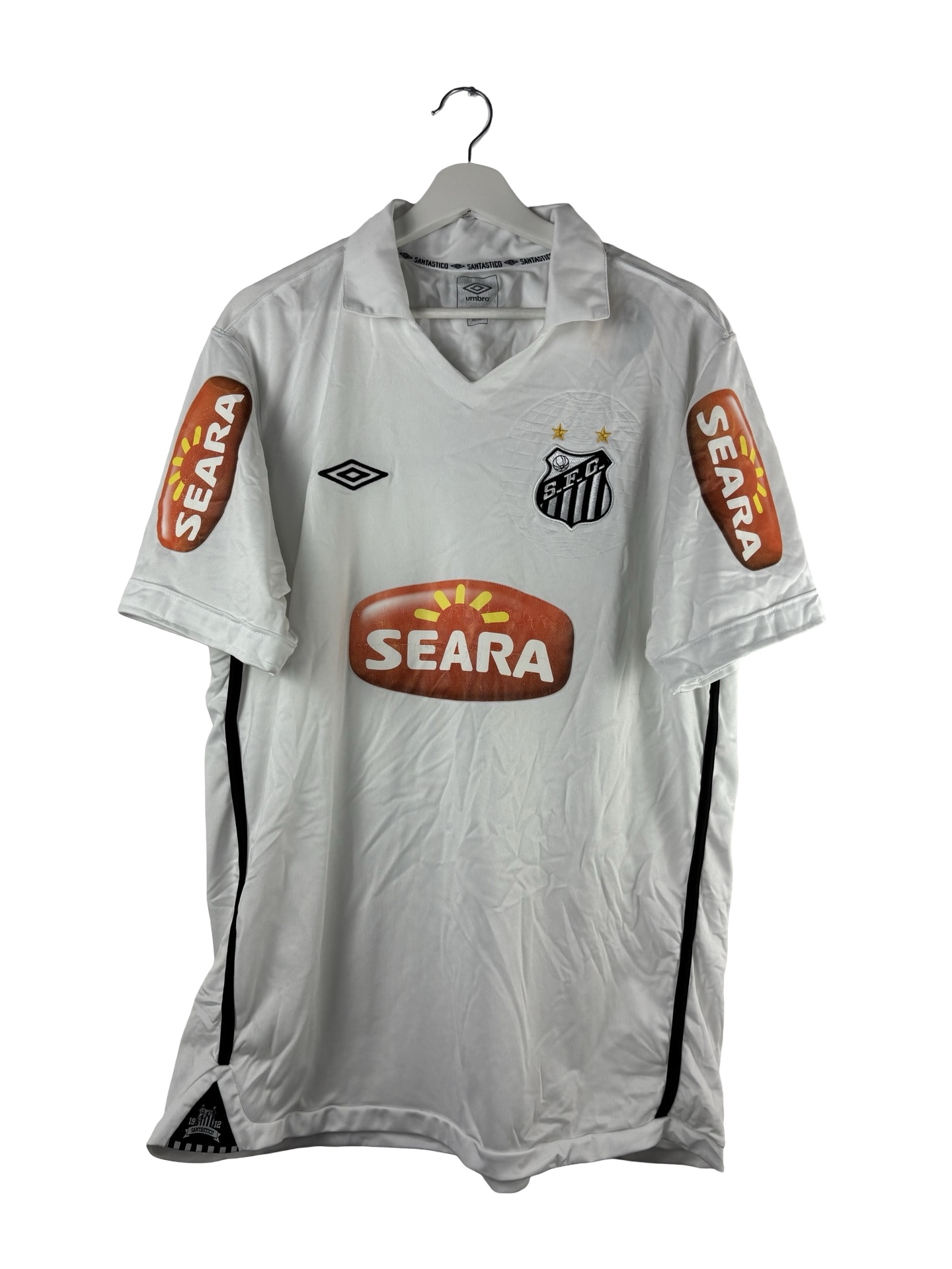 Maillot exceptionnelle époque du rookie Neymar dans son club formateur du Brésil. Il quittera ensuite Santos pour le FC Barcelone en 2013 pour 88M d’euros. Maillot très rare domicile signé Umbro. Sponsor Seara.