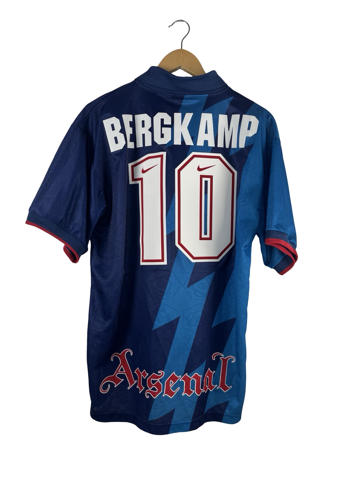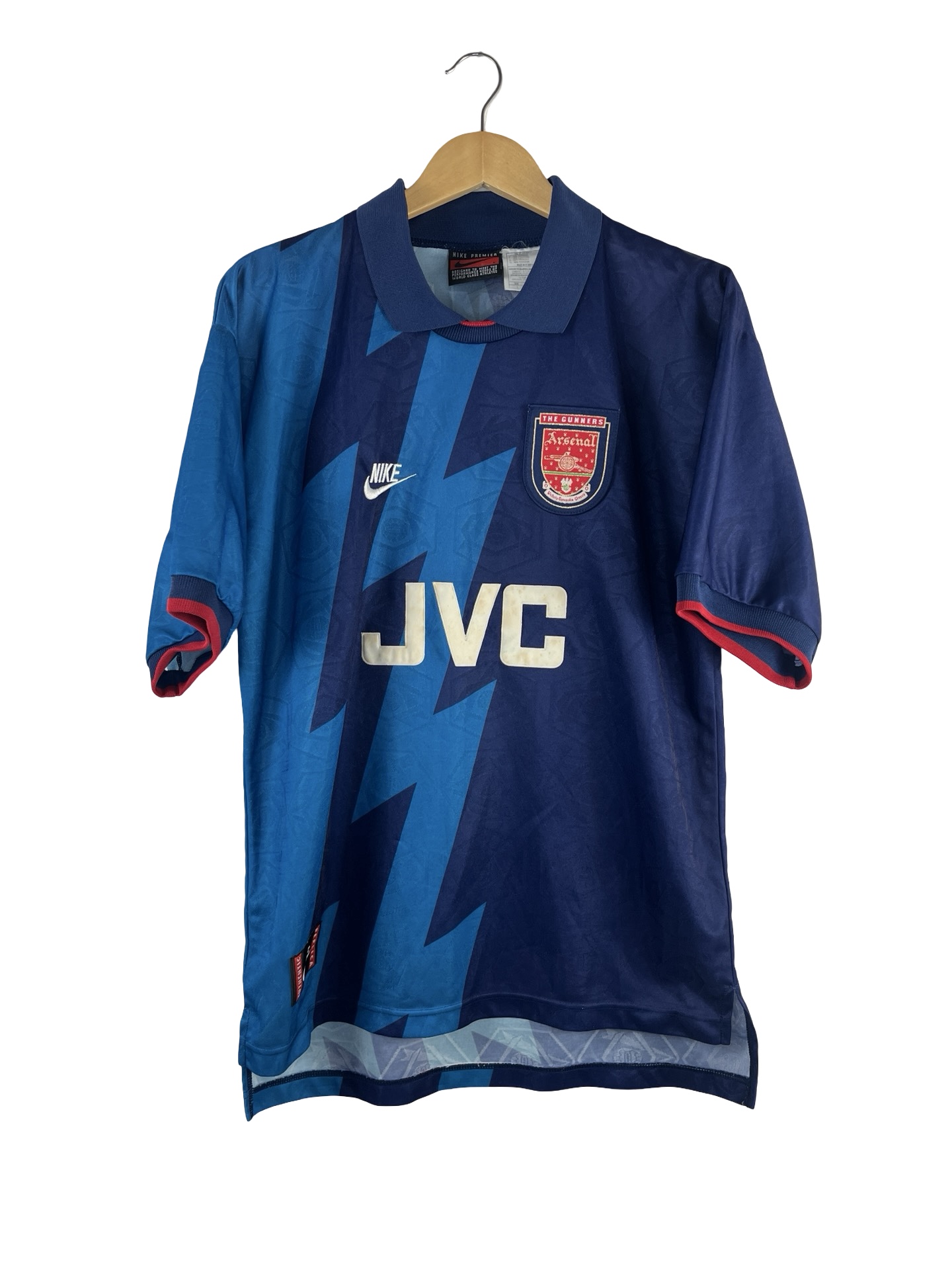 Maillot vintage d’Arsenal saison 1995/1996. Maillot extérieur porté par les Gunners durant une saison mitigée. Les hommes de Bruce Rioch termineront à la quatrième place de Premier League et ce malgré les 15 buts de Ian Wright. C’est la première saison du néerlandais Dennis Bergkamp à Arsenal en provenance de l’Inter. Époque Bergkamp, Campbell, Hillier, Harper, Seaman, Wright