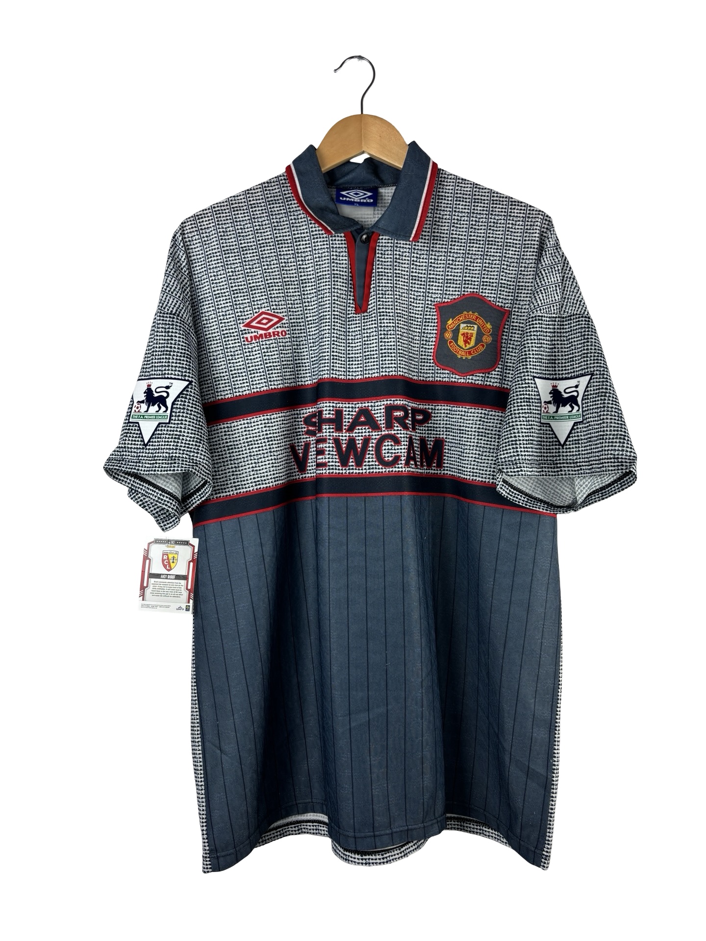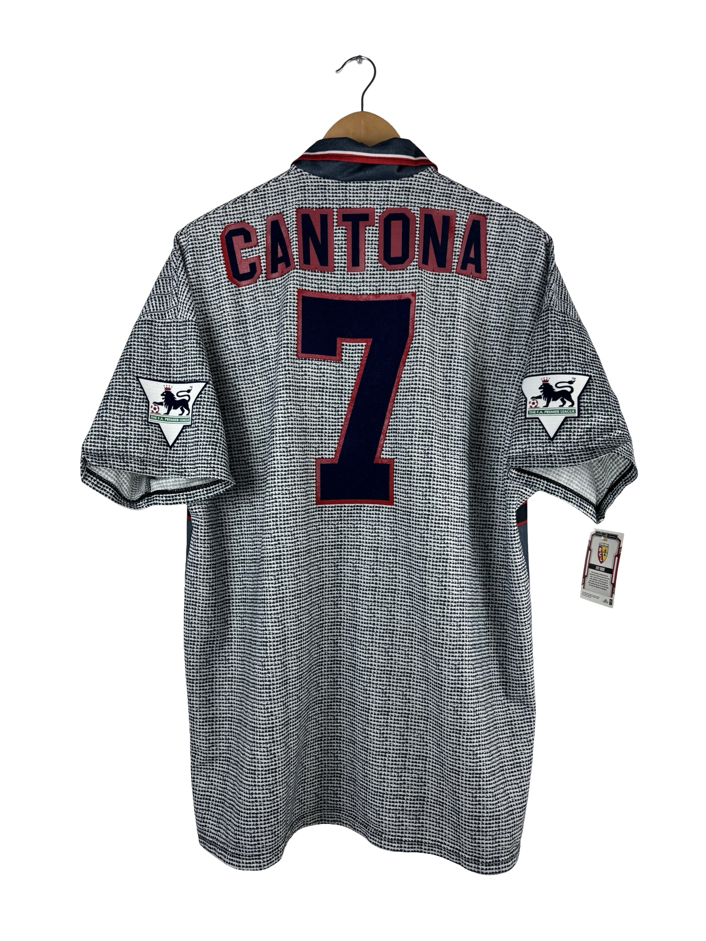 Maillot extérieur de Manchester United saison 1995/1996. Rare maillot extérieur porté par les Mancuniens entraînés par Alex Ferguson, ils gagneront une nouvelle Premier League. Les Red Devils gagneront aussi la FA Cup emmenés par Eric Cantona et le nouveau génie du foot anglais David Beckham. Maillot iconique de chez Umbro floqué Eric Cantona 7. Époque Eric Cantona, Giggs, Keane, Sharpe, Beckham