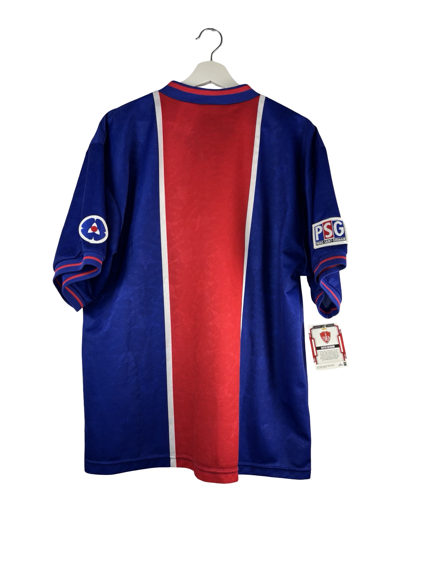 Maillot vintage du PSG saison 1995/1996. Maillot iconique du Paris Saint Germain bleu et rouge avec sa bande Hechter.