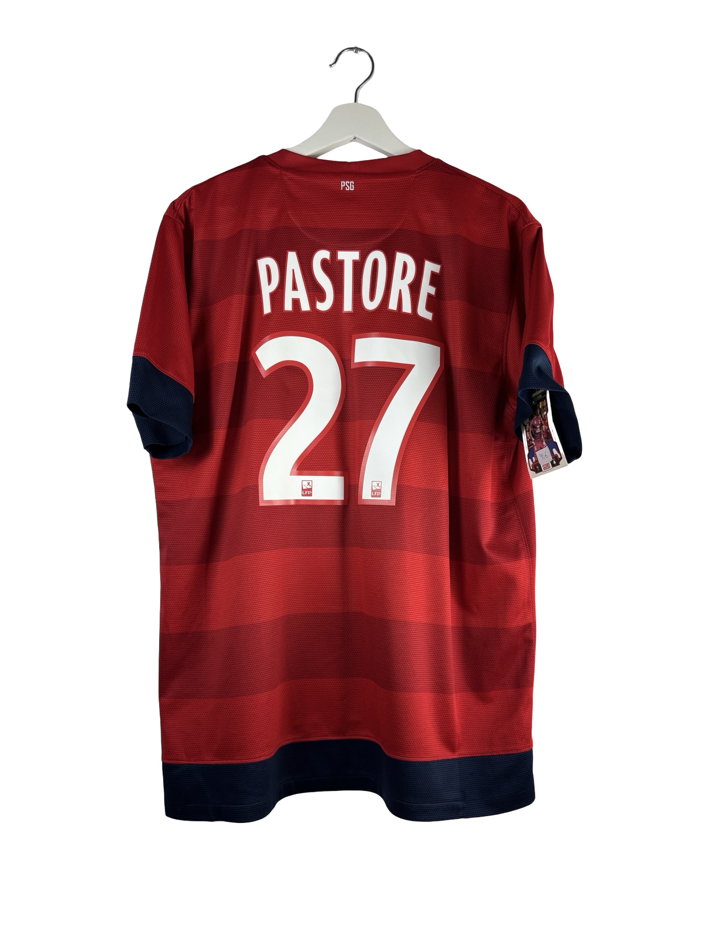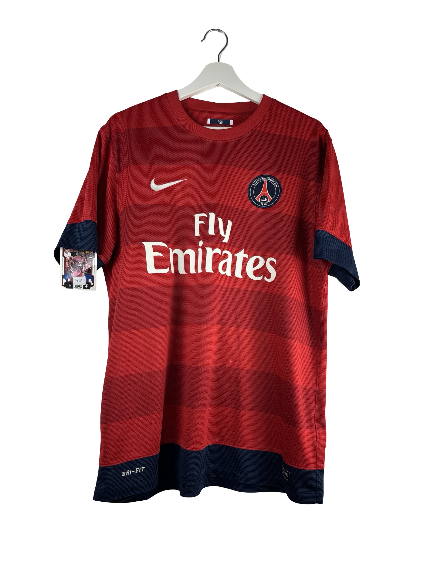 Maillot vintage du PSG saison 2012/2013. Maillot domicile porté par les Parisiens entraînés par Carlo Ancelotti lors de la deuxième saison sous l’ère qatarie du PSG. Paris finira champion devant l’OM à 12pts d’écarts. C’est la première saison du géant suédois Zlatan Ibrahimovic qui finira meilleur buteur avec 30buts. Époque Ibrahimovic, Gameiro, Thiago Motta, Pastore, Matuidi, Alex, Lavezzi, Thiago Silva.