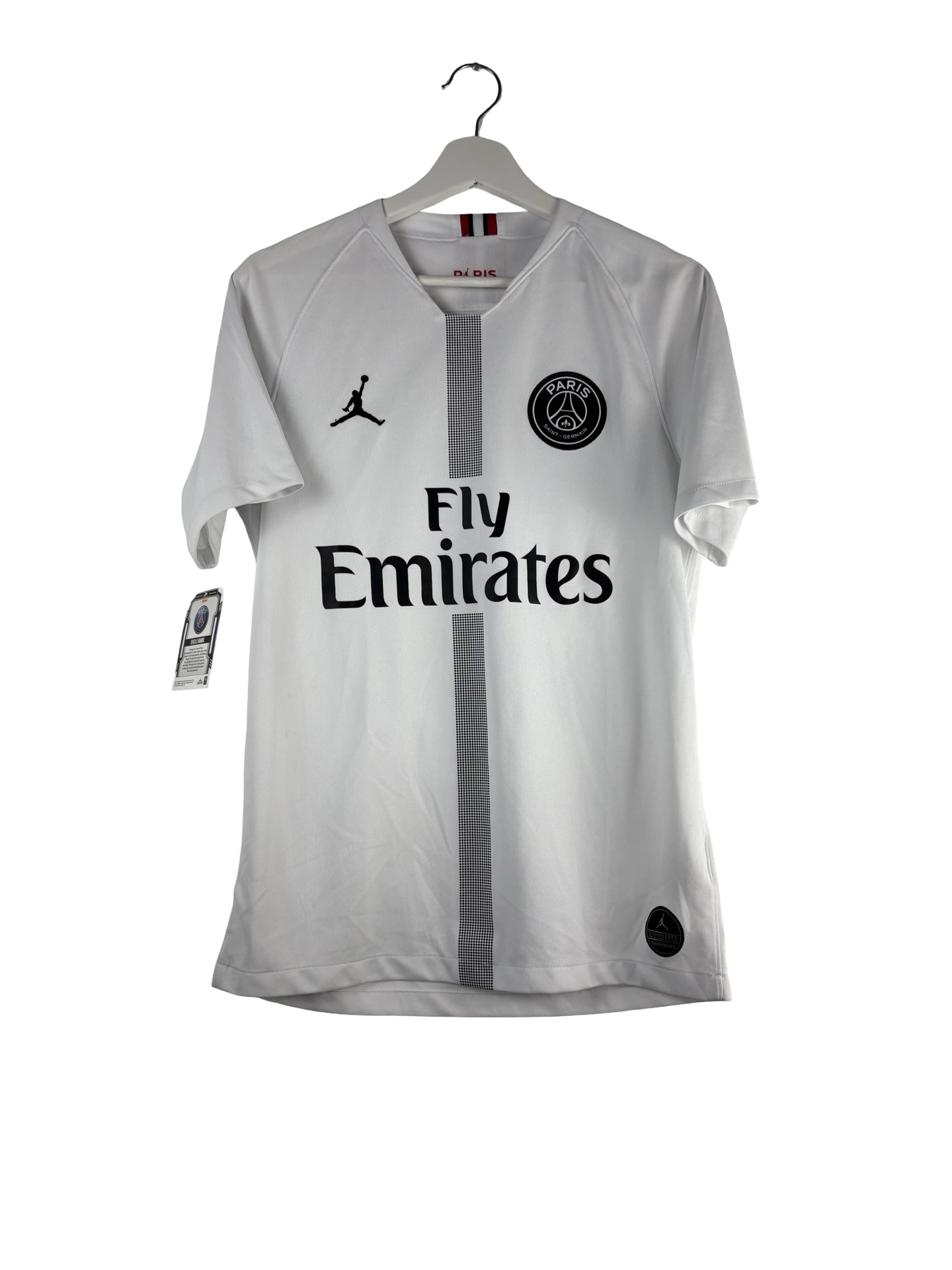 Maillot fourth du PSG saison 2018/2019. Maillot Jordan porté par les parisiens lors de la première année de Thomas Tuchel au club. Malgré les 39 buts toutes compétitions confondues de Kylian Mbappé, le club parisien sera éliminé par Manchester United en 8ème de finale de Champions League. Presnel Kimpembe est le malheureux qui donnera le penalty de la victoire aux Red Devils.