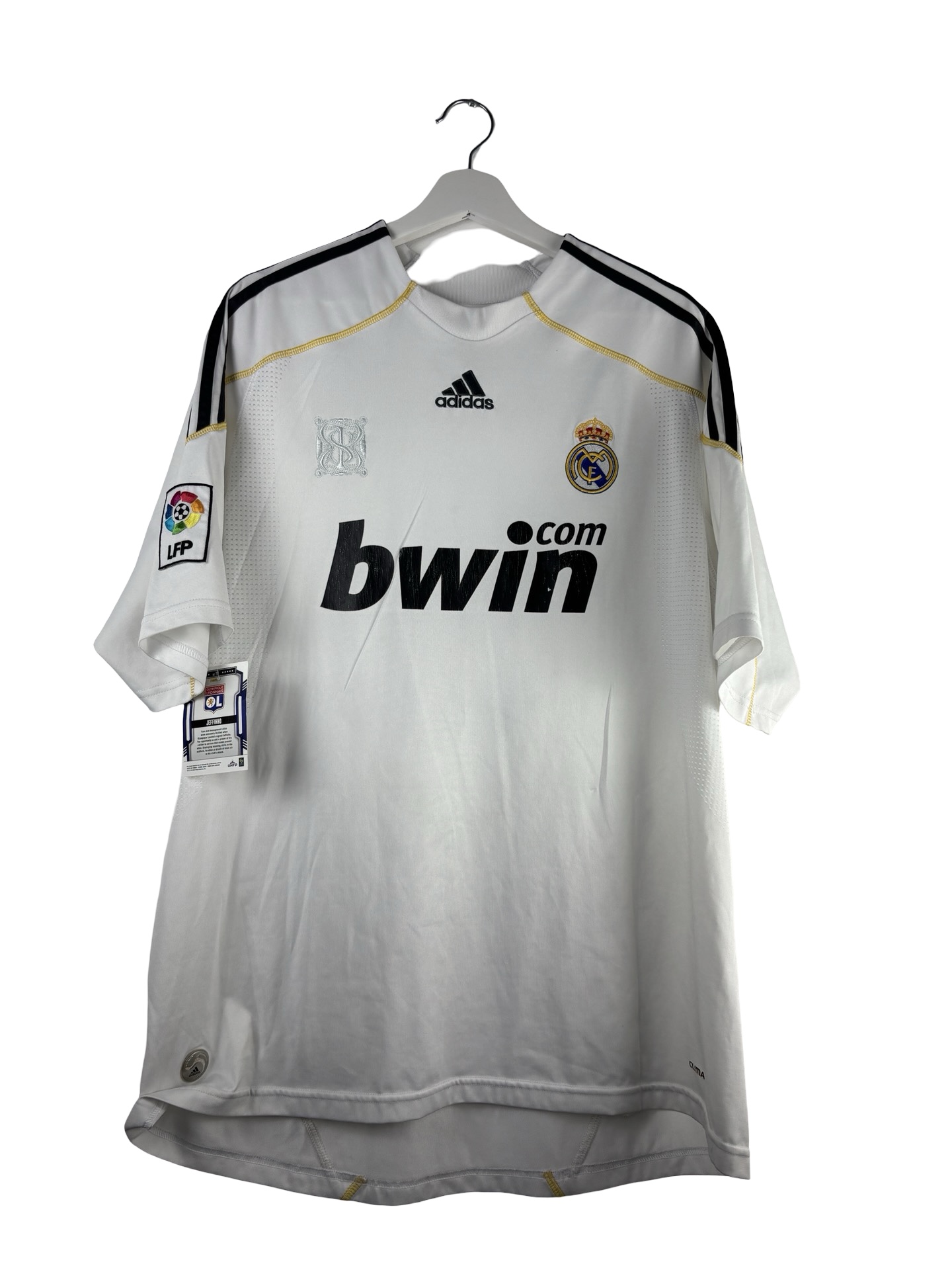Maillot domicile du Real Madrid saison 2009/2010. Maillot domicile porté par les Merengues lors de la saison suivant le recrutement de Kaka, Benzema, Xabi Alonso ainsi que la star portugaise Cristiano Ronaldo. Malgré un effectif incroyable, le club de la maison blanche ne terminera sa saison qu’à la seconde place du championnat, à 3 points du Barca.